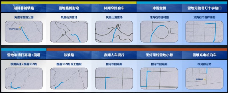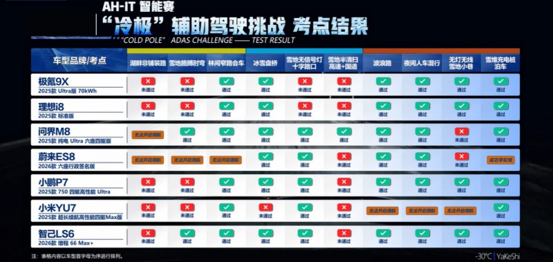 先说说这场比赛的含金量,可不是随便拉个场地就能比的,北纬53度的严寒地带,零下30℃的气温低到能让电池活性暴跌、电子设备罢工(测试中有车型中途摄像头起雾趴窝)。370公里赛程涵盖了10种冬季各种极端路况,路上积雪路滑都是基础考验,更有胳膊肘弯、冰雪弯道、无灯无线雪地小巷等高难度路段接连登场,即便东北本地老司机开着车都得小心翼翼,对辅助驾驶系统来说更是“冬测高考”!