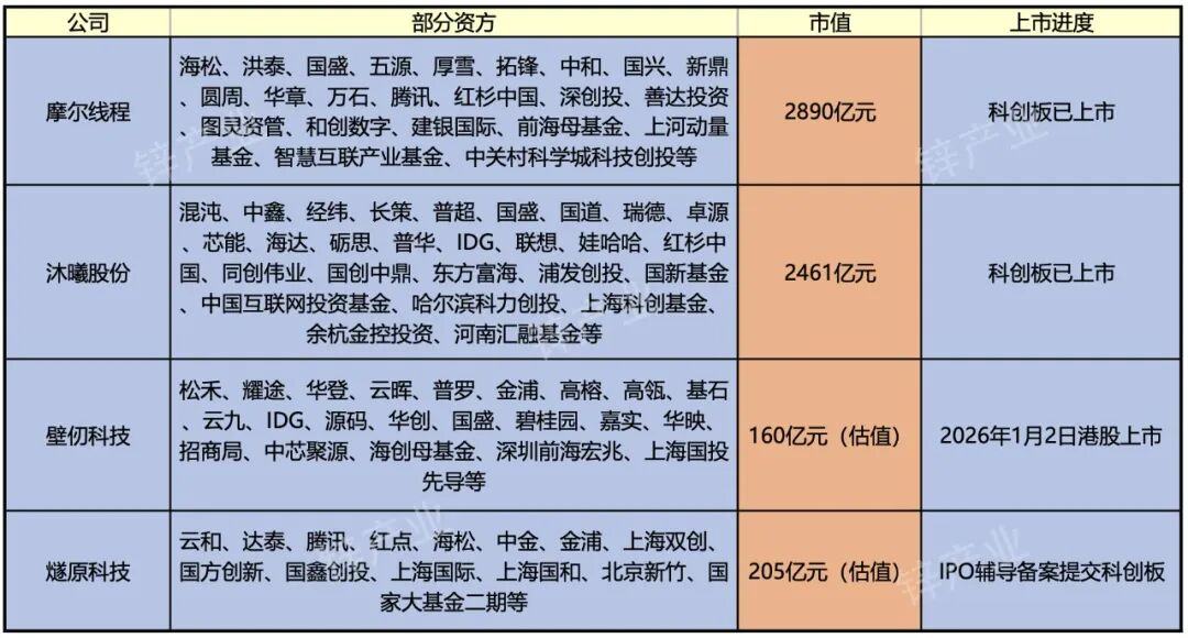 同样被资本热捧的还有国产GPU四小龙,从过往融资经历来看,四小龙已经成为明星标的,每家身后都站着一整个明星投资机构方阵。