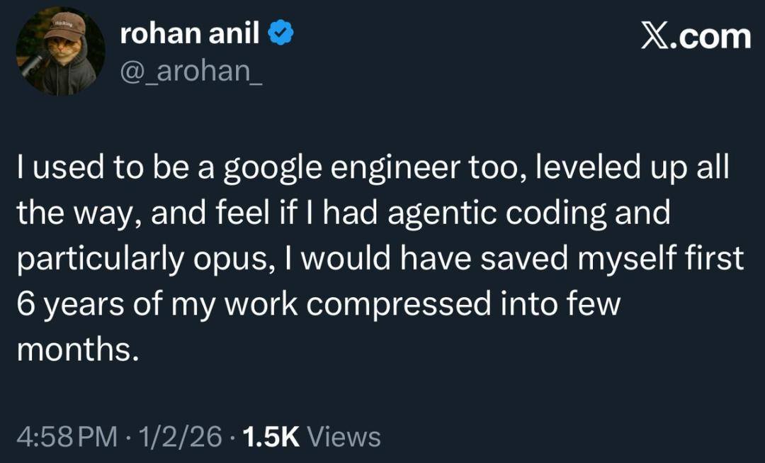 Anthropic现役工程师,Google DeepMind前杰出工程师Rohan Anil就分享称,“如果我有编程Agent,尤其是Claude的Opus,我能把我前6年的工作压缩到几个月内(完成)”。