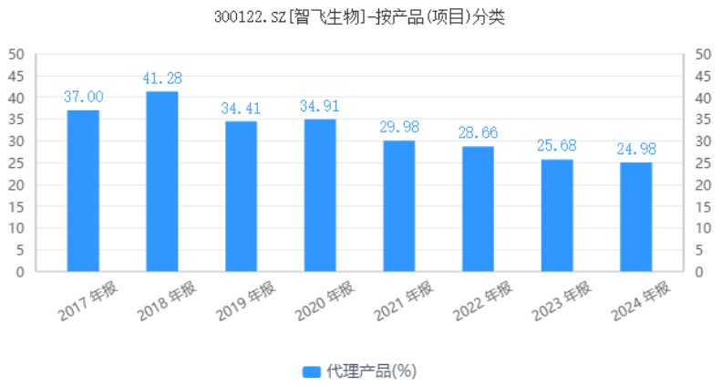 与此同时,在持续的价格竞争压力之下,智飞生物销售毛利率也出现了明显的下滑。2020年-2024年,智飞生物代理产品毛利率分别为34.91%、29.98%、28.66%、25.68%和24.98%,逐年下滑趋势非常明显。2025年上半年,智飞生物代理产品毛利率降至22.61%,同比下滑8.61个百分点,再创历史新低。