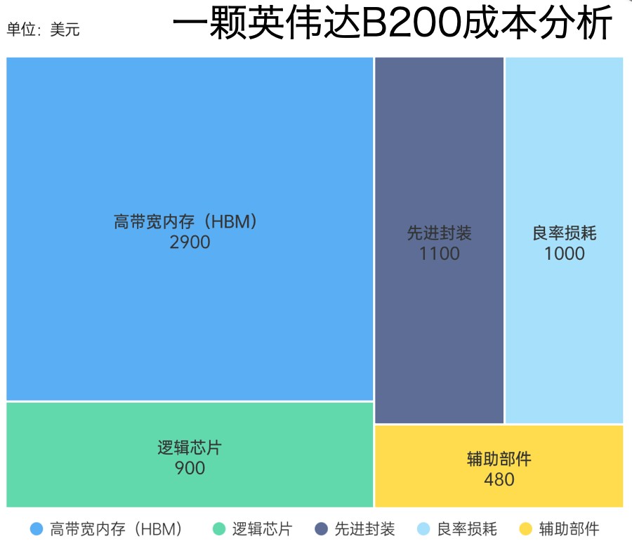 以一张英伟达B200显卡为例,最大头的成本来自HBM3E显存,成本在2800到3100美元,占了将近一半的成本,比GPU还贵。