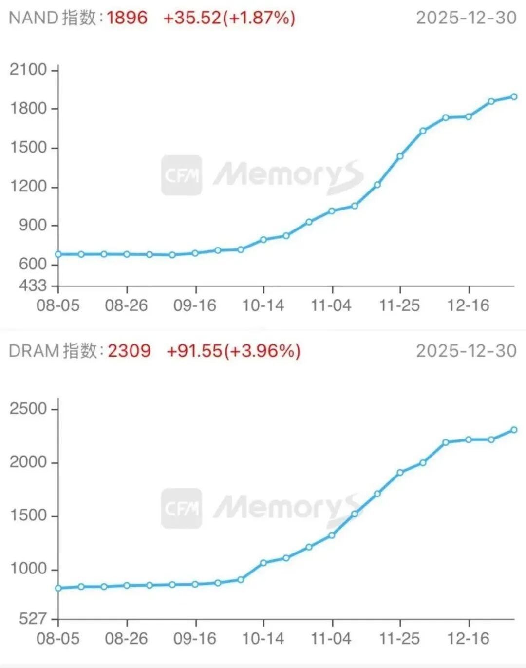 从行业指数来看,NAND指数更为温和 来源:CFM