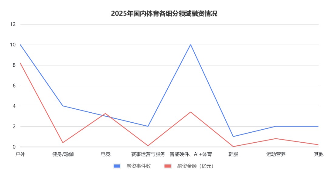 倘若户外是当下,那么“AI+体育”或许就是资本押注的未来。2025年,围绕AI方向,体育领域投资活跃,共有10起投融资事件(约占事件总数的27.78%),金额共3.4亿(占总额约20.29%)。