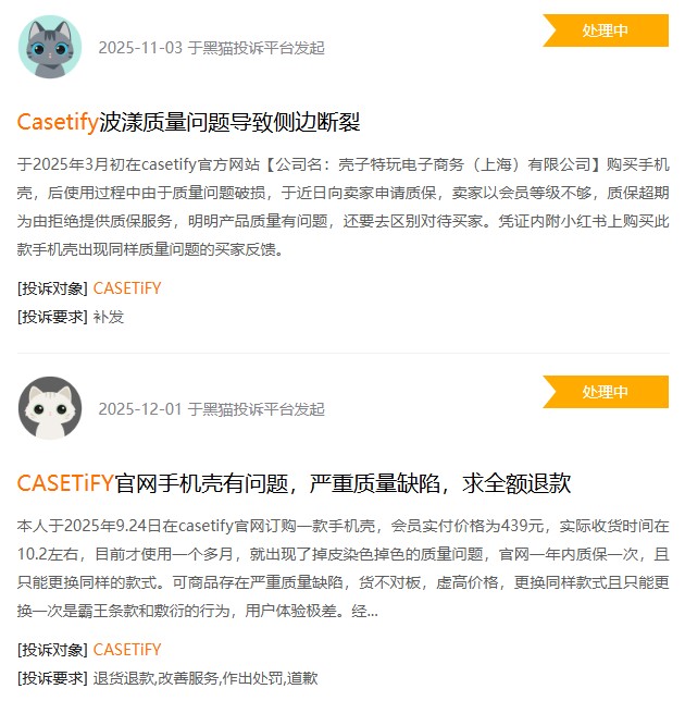 有消费者在官方旗舰店购买数百元的手机壳没用多久就出现开裂发黄的现象,还有消费者的手机壳出现断裂…黑猫投诉平台上有关CASETiFY的投诉量超过400条,其中有不少集中在产品质量缺陷方面。