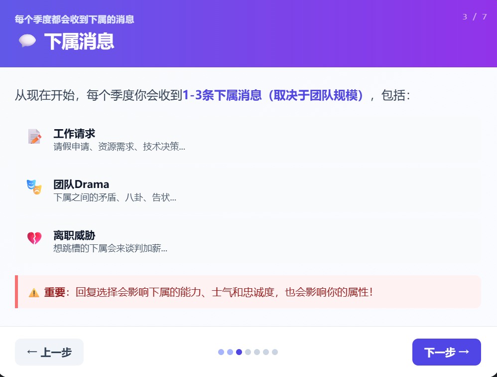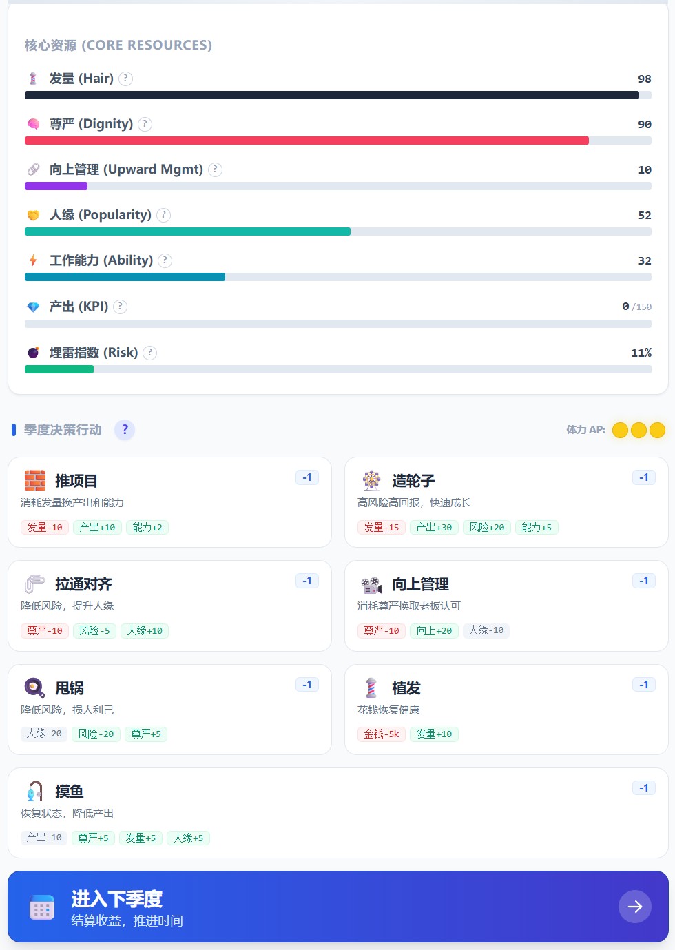 每个季度(回合),玩家都有三次行动机会,可以选择推项目、摸鱼、向上管理等等,来更迭自身的七大数值。每季度都会有不同的事件触发。比如,一季度是绩效考核与发年终奖,二季度可以招人,三季度是晋升答辩。