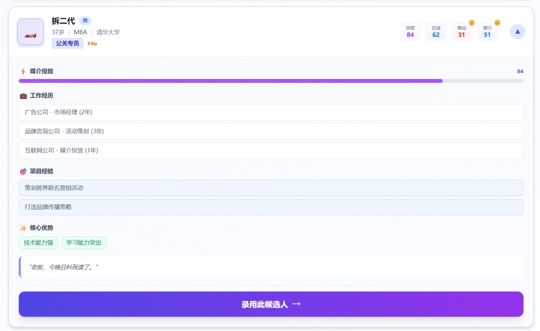 像这种家里有钱,能力强的候选人,我肯定要。关键是他还请大家吃日料。至于稳定度,那是hr该考虑的事。(而且该版本稳定和潜力属性暂未启用)