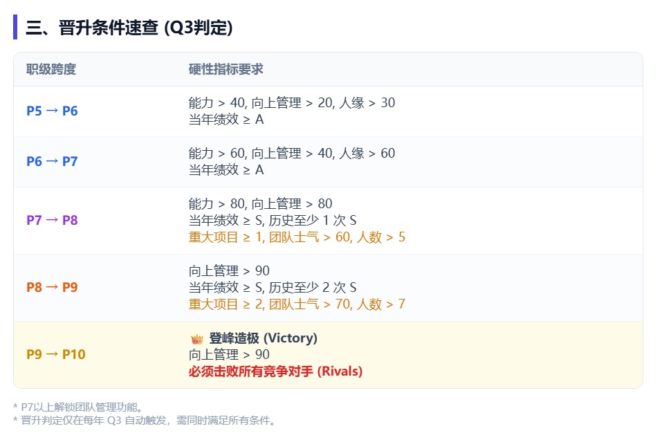 P5和P6阶段,玩家基本只用关心推进产出,产出是最主要的晋升考核标准。而当玩家升到P7后,游戏将更新一个新的系统:团队。整个季度行动内容,也会产生巨大的变化。