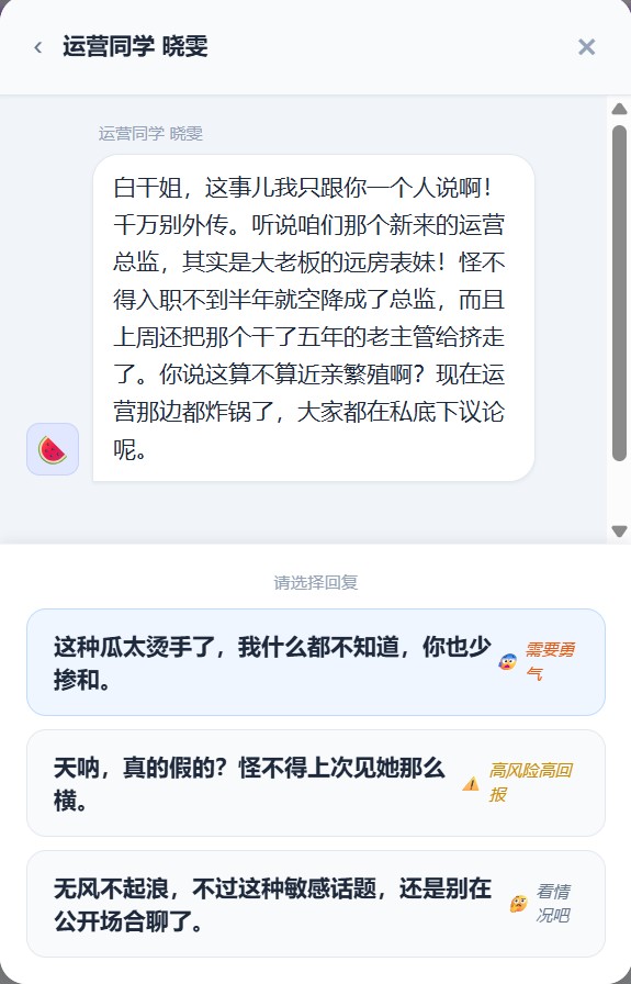 小羊说,这些系统、体验的变化,是为了还原现实中职场不同阶段的工作要求,员工可以从领导的视角来看一些决策。比如压榨员工,给员工打低绩效,为了抢资源费空心思。领导也是被困在系统里的人,会痛苦,会挣扎,因为要对更大的领导负责。