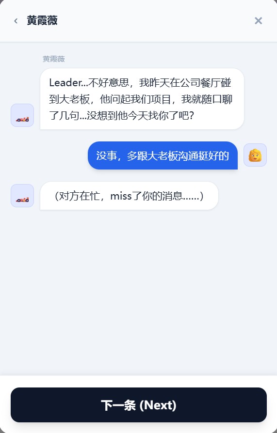 每个季度,游戏会随机生成对话。玩家需要点击右下角的消息图标,回复其他人的消息。对话内容随玩家职级变动,目前该玩法还在完善中。