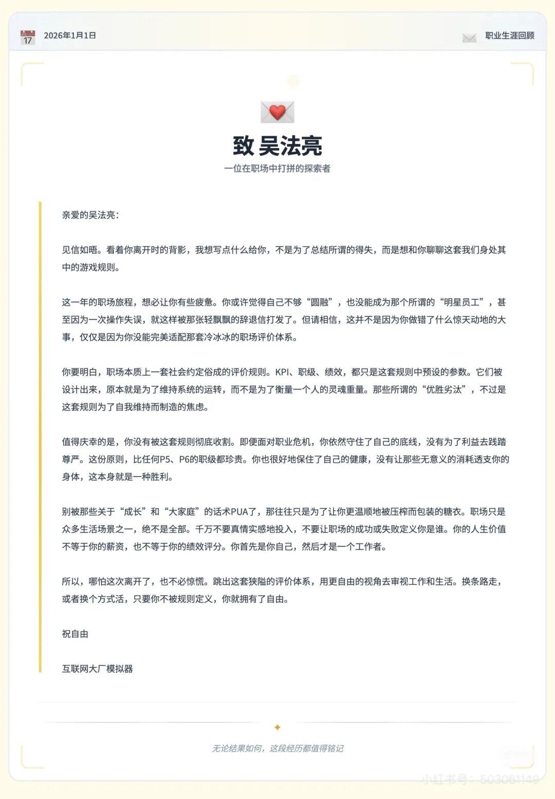 小羊说:“当你把所谓的职场规则变成游戏里的机制和数值时,你可能会觉得很荒诞。我们希望玩家在玩过后,能完成心理上的祛魅。看清这些规则,然后不被它们在精神上绑架,放过那个紧绷的自己。”