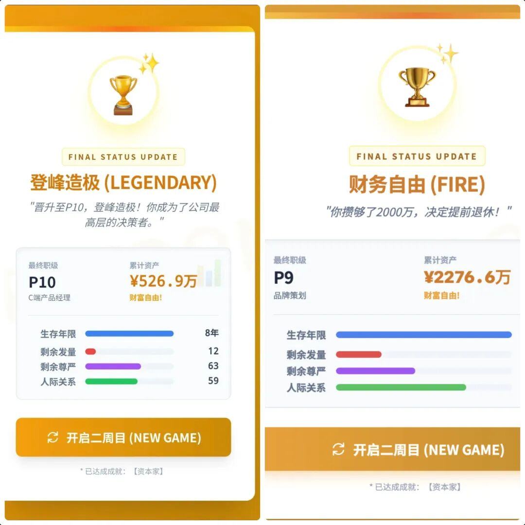《大厂模拟器》是个网页端数值游戏,玩家需要扮演在大厂工作的打工人,从P5职级干起。游戏有发量、向上管理、KPI等多种数值维度,难度较高,玩家需要在游戏中经历反复博弈和计算。升上P10,或者攒下2000万,才能通关。