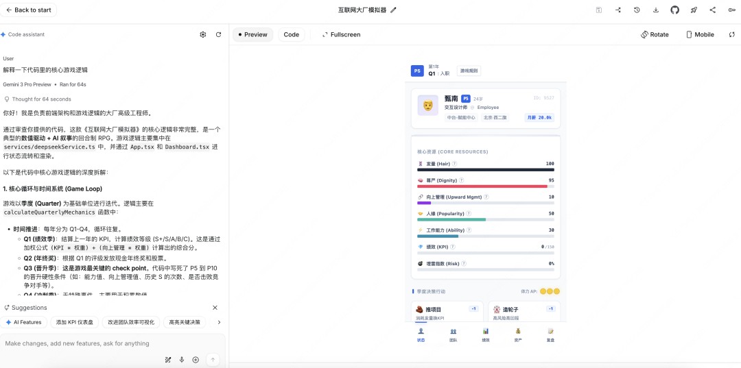 最初,两人选择利用Google AI Studio来开发《大厂模拟器》,游戏的首版界面、交互和玩法框架,都是通过Gemini生成的。两人先做了一些产品需求文档,然后输入进Gemini,Gemini再把文档拆分成适合让AI开发的一些指令。