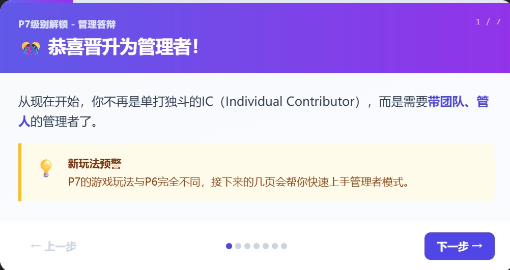 伊点的理想情况是,P7以前,很多对话可能来自玩家的领导,平级或者实习生。P7以后可能会来自玩家的下属,来自P9、P10的大领导,甚至CEO,或其他部门的竞争对手,等等。当玩家的职级越大,在公司内需要接触的人、需要思考的事情就越多。