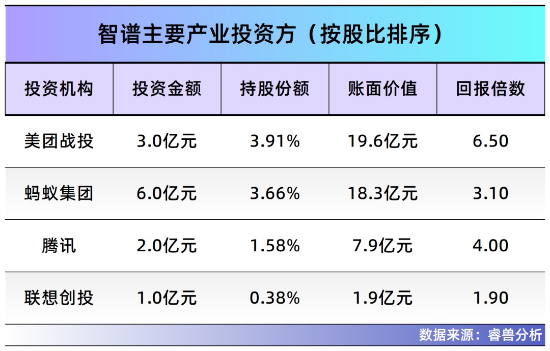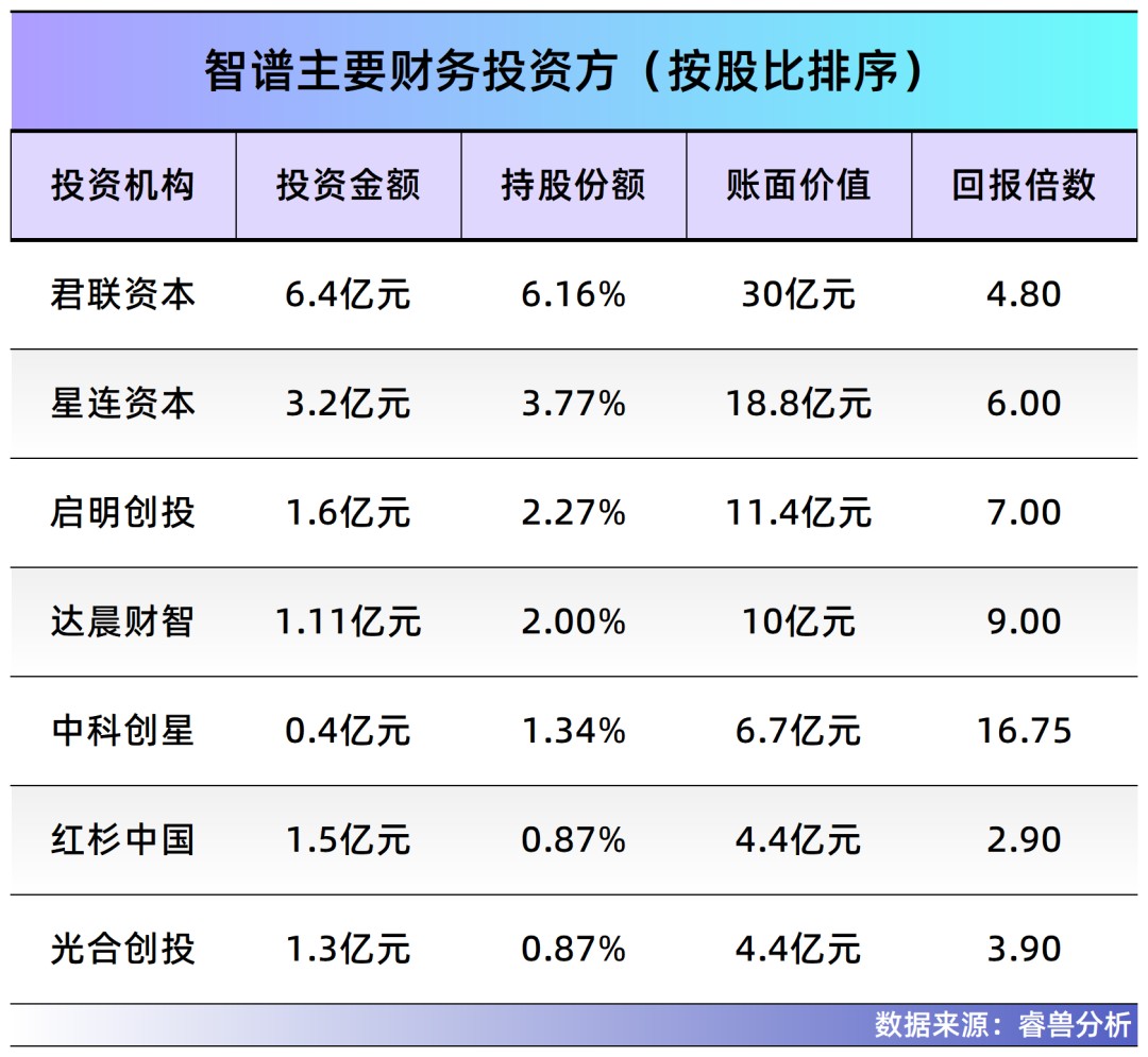 根据招股书,智谱的主要外部股东是君联资本(为智谱最大外部股东)、美团战投、星连资本、蚂蚁集团、启明创投、光合创投等,分别持有发行后的6.16%、3.91%、3.77%、3.66%、3.57%、2.27%、0.87%。