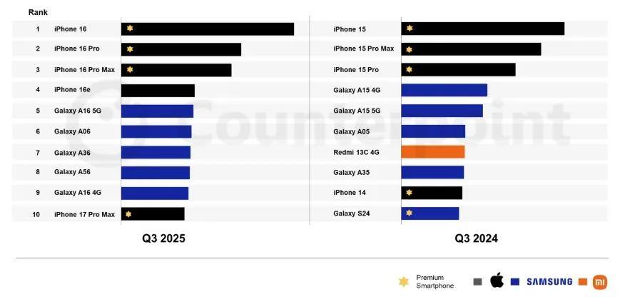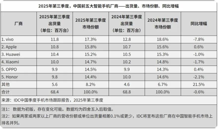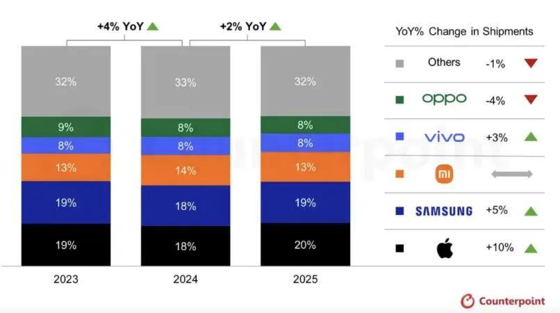 根据Counterpoint最新发布的数据,2025年全球智能手机出货量同比微增2%,苹果以20%的市场份额超越三星,时隔14年重返全球第一宝座,小米、vivo、OPPO分列3-5位。