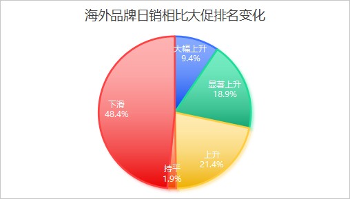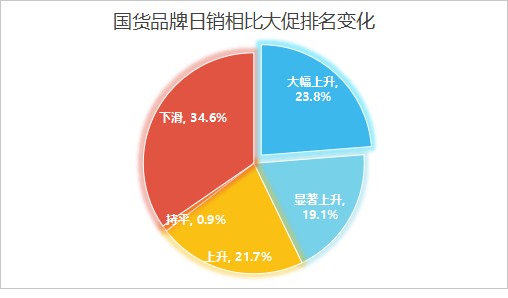 另一大趋势是国货品牌正在靠平销弯道超车。国货品牌中有24%在这一季度排名大幅提升,已经远远超过海外品牌。