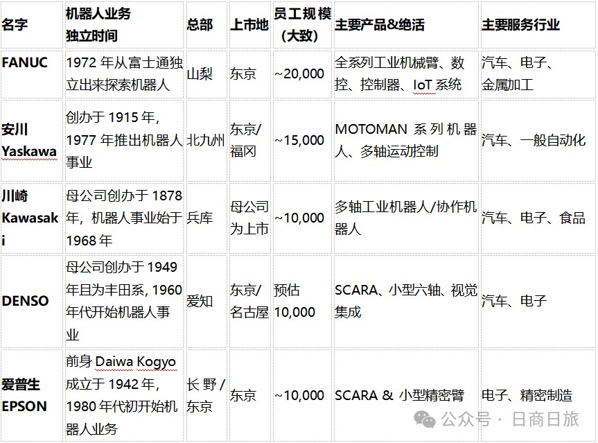 Fanuc的背景是富士通,数控专家出身,安川是电机、电气控制,川崎是重工业,Denso是汽车零部件起家、且与丰田长期合作。