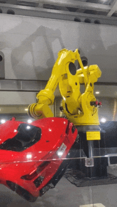 笔者拍到了FANUC最出名的R-2000系列,现场演示搬汽车,这个系列问世30年了,令人肃然起敬。
