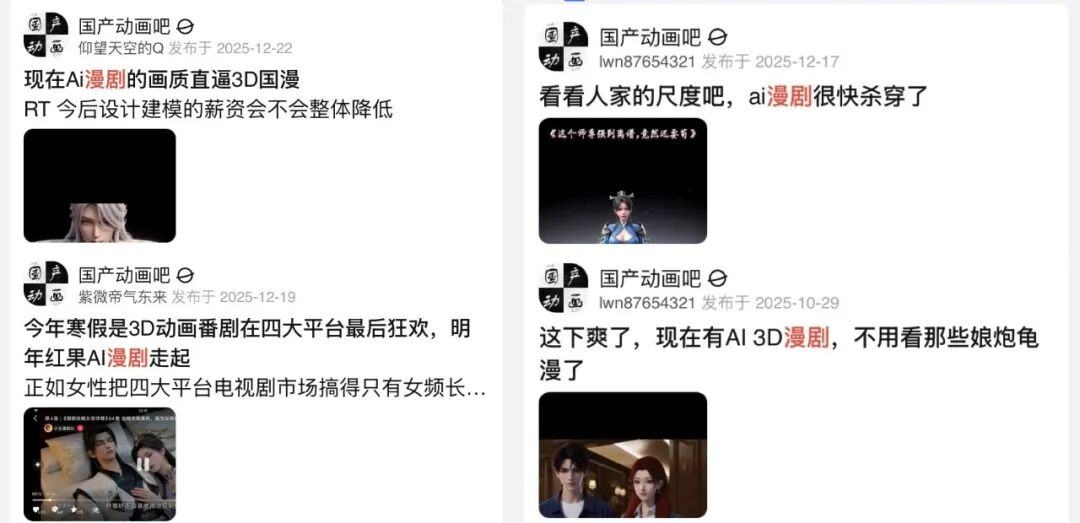 打开26万用户聚集的百度“国产动画吧”,我们发现讨论漫剧的帖子也正在越来越多,不少人认为男频漫剧无需迫于舆论压力而“自我阉割”,可以更忠实地呈现原著的精髓。