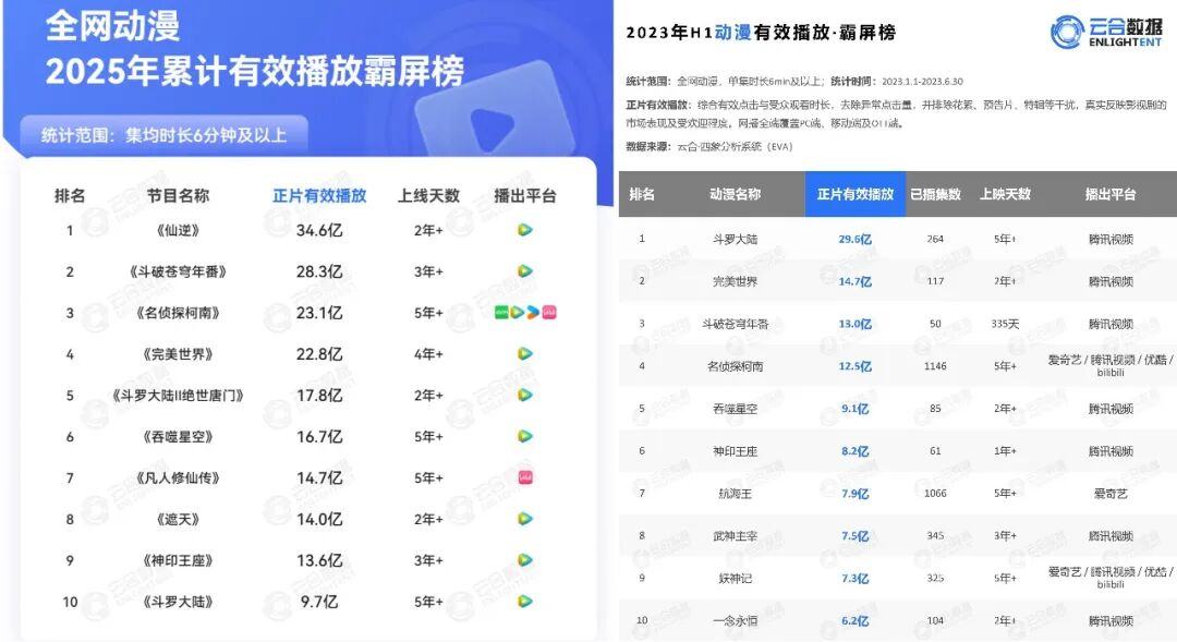 虽然云合数据没有披露2025年全网动漫总体播放数据,但我们可以通过纵向对比,来看看过去一年头部作品的“水位”是否有所下降。2025年之前,云合数据并未统计动漫作品的年播放量,我们就用2023年上半年动漫播放霸屏榜来作为参照。
