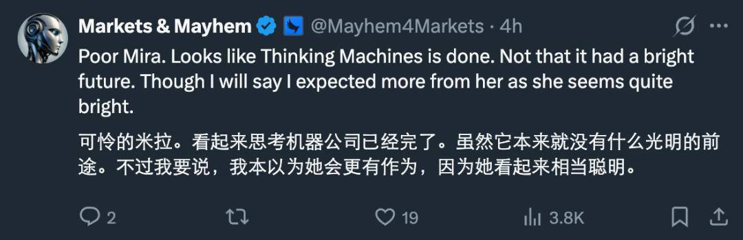 无论真相如何,这次事件都将给 Thinking Machines Lab 带来一些打击。甚至有悲观的网友认为,这家公司「已经完了」。