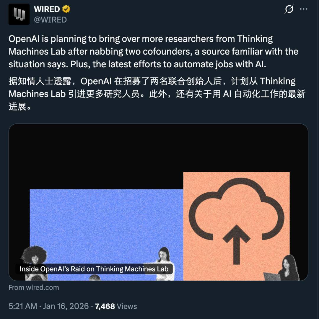 参考链接:https://www.wired.com/story/inside-openai-raid-on-thinking-machines-lab/?utm_brand=wired-science&utm_campaign=aud-dev&utm_medium=social&utm_social-type=owned&utm_source=twitter-science