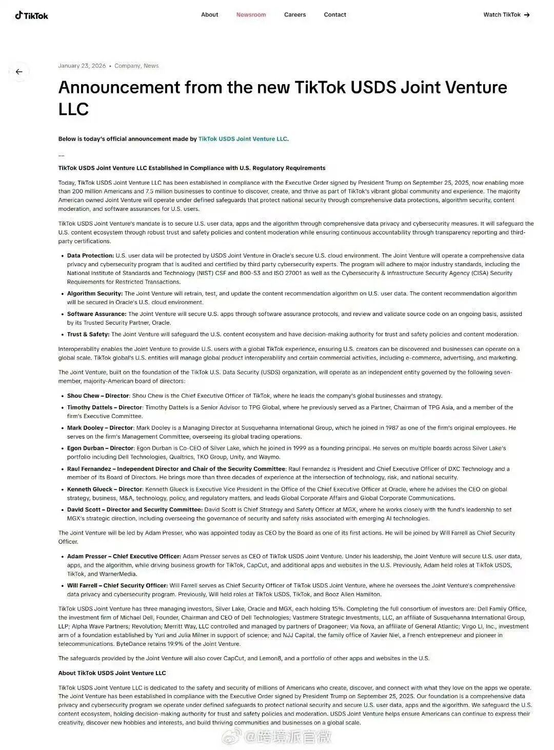 该合资企业将由首席执行官亚当·普雷瑟 (Adam Presser) 和首席安全官威尔·法雷尔 (Will Farrell) 共同领导。普雷瑟此前曾领导TikTok在美国保护美国用户数据的工作,而法雷尔则领导了这项工作的隐私和安全工作,属于“自己人管自己事”,而非外来接管。