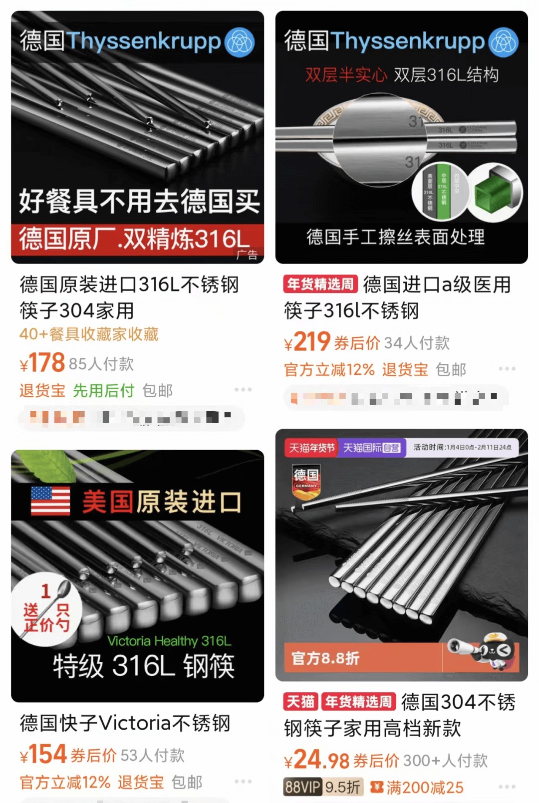 最直观的例子就是:电商平台上,至今还有大量明明是中国设计、中国制造,却还要说是“德国品质”的东西——德国泡茶壶、德国电饭煲、德国筷子、德国砂锅......德国人什么时候开始天天煮米饭、煲砂锅粥、喝茶、用筷子吃饭了?