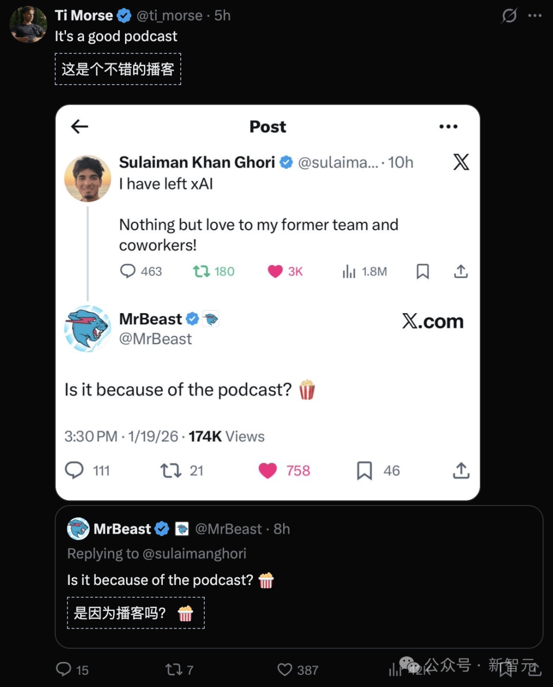 美国知名视频博主MrBeast在线吃瓜?,询问离职到底是不是因为播客。