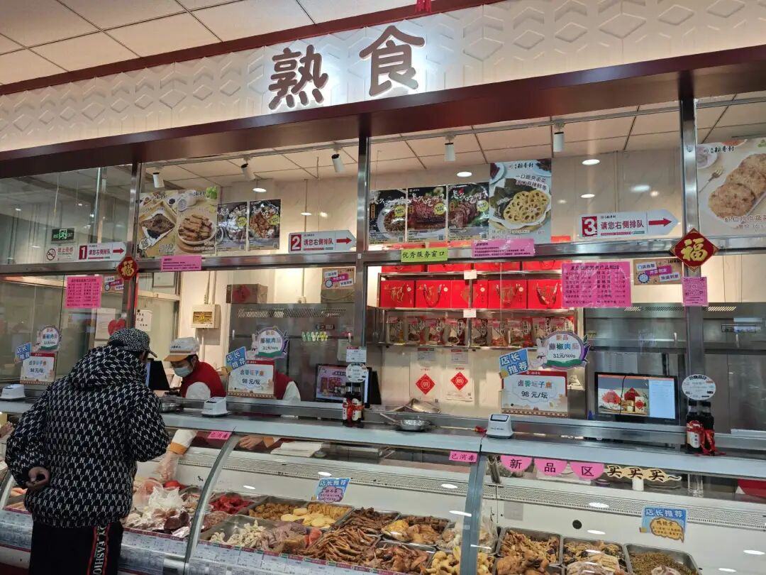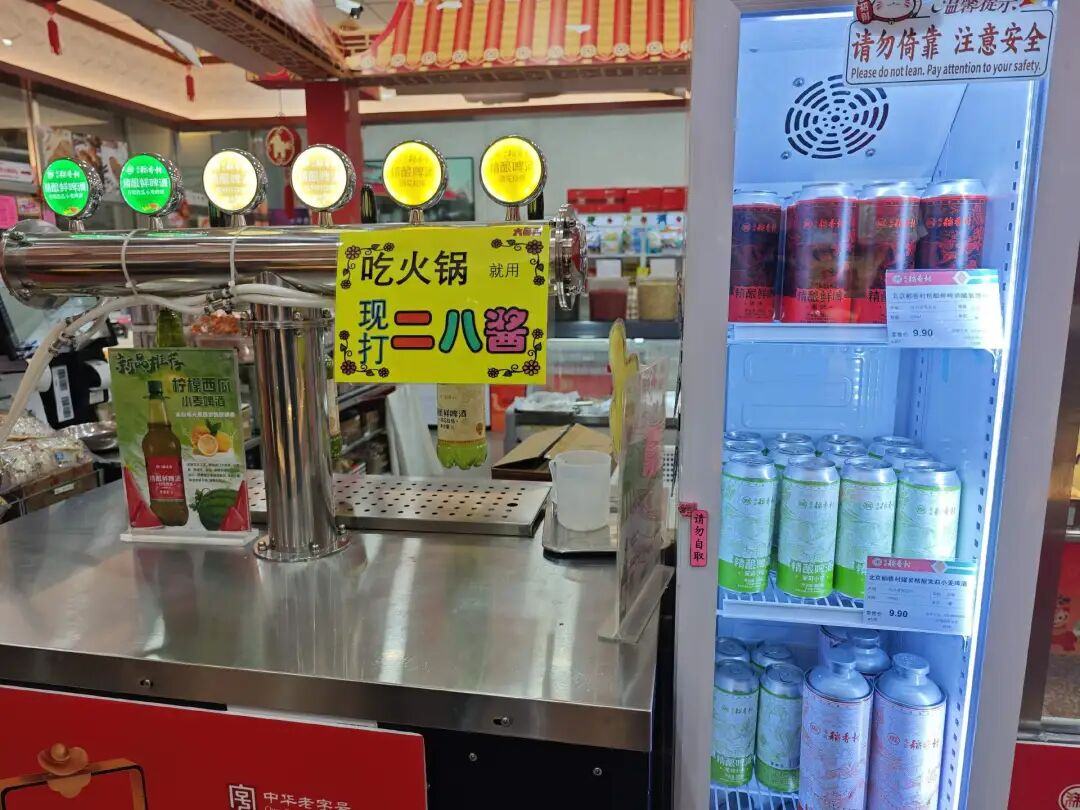 我们首先去了位于张自忠路地铁站附近的“稻香村第一营业部”。走进店里,仿佛进入了一间小超市,左手边是大家最常购买的京味糕点,其他柜台还在售卖新鲜熟食、速冻食品、盒装零食等,甚至还有现打鲜啤和灌装精酿。