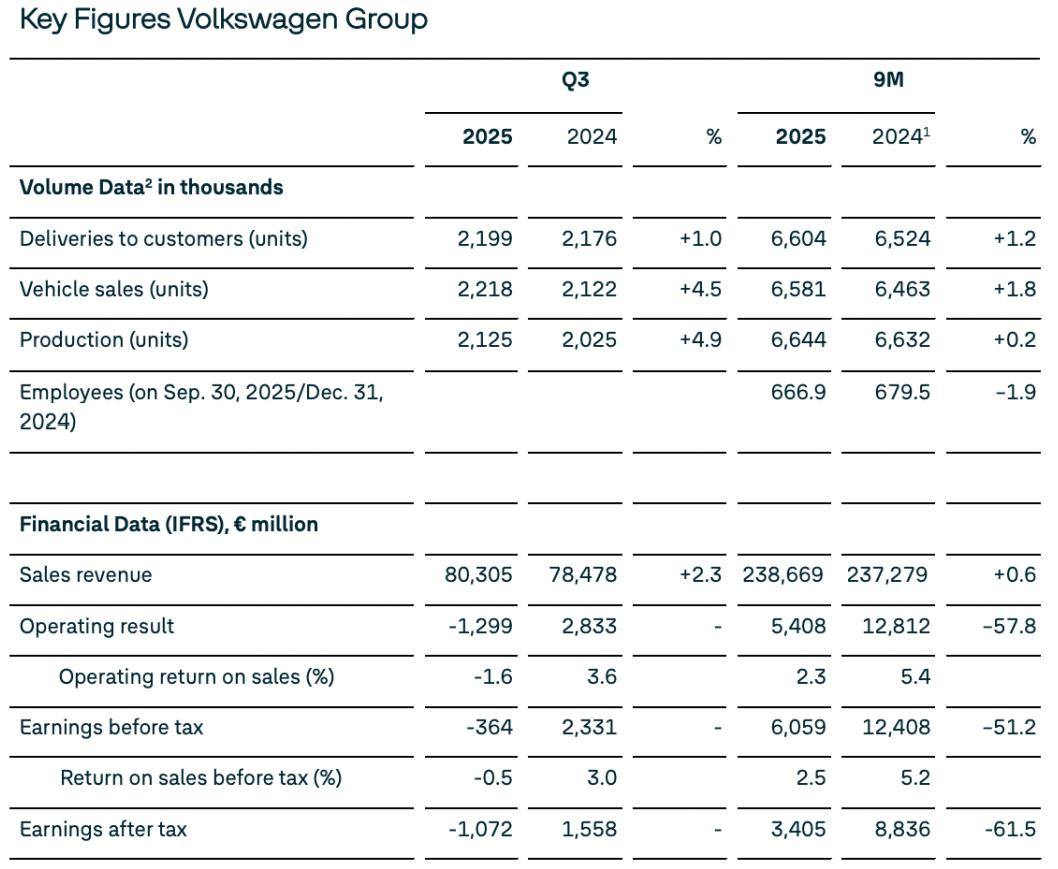 更严重的是净亏损10.72亿欧元,去年同期净利润还是15.58亿欧元,同比下降约168.8%,这也是近五年来大众汽车的首次季度亏损,今年前三季度,大众汽车集团净利润与上年同期相比大幅下降61.5%,至34亿欧元。
