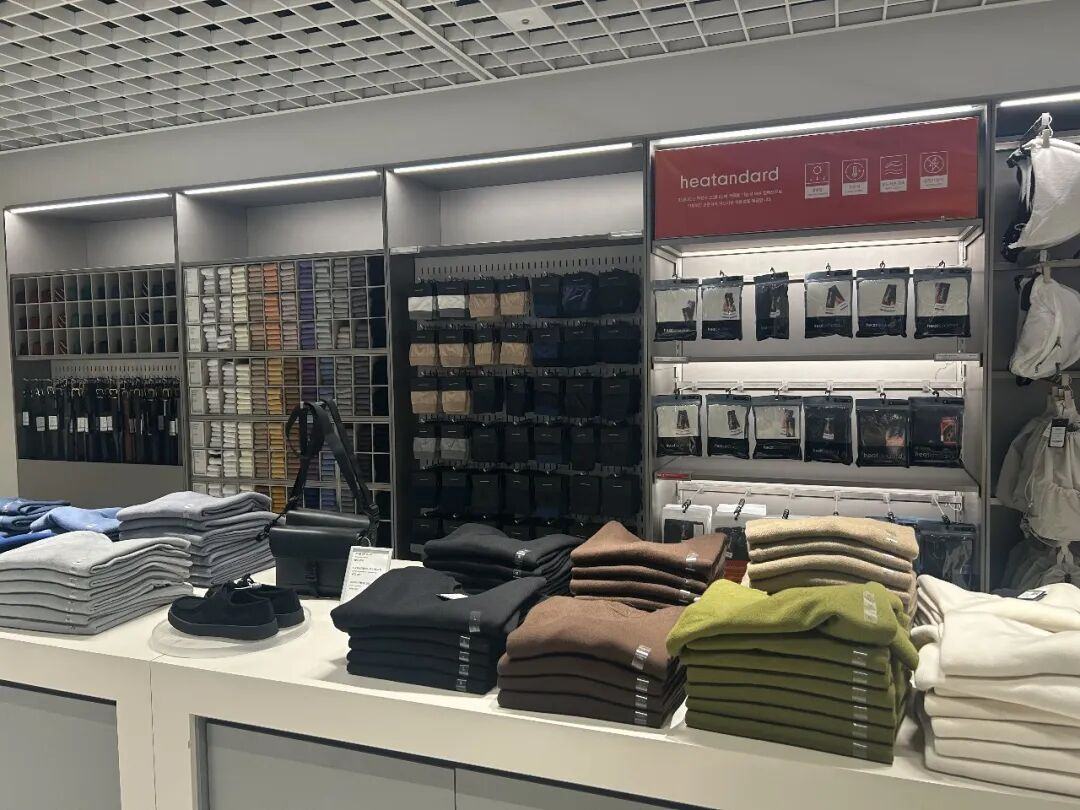 其次是商品陈列上,与传统快时尚密集堆叠的货架不同,Musinsa Standard门店以仓储式大店为特色,数千件单品在开阔空间里陈列,从保暖内衣到衬衫、费尔岛毛衣以及当下热门的排骨羽绒服,价格从80元到700元不等,有些商品定价略低于优衣库,部分商品还标注着“一日特价”,覆盖大众消费需求。