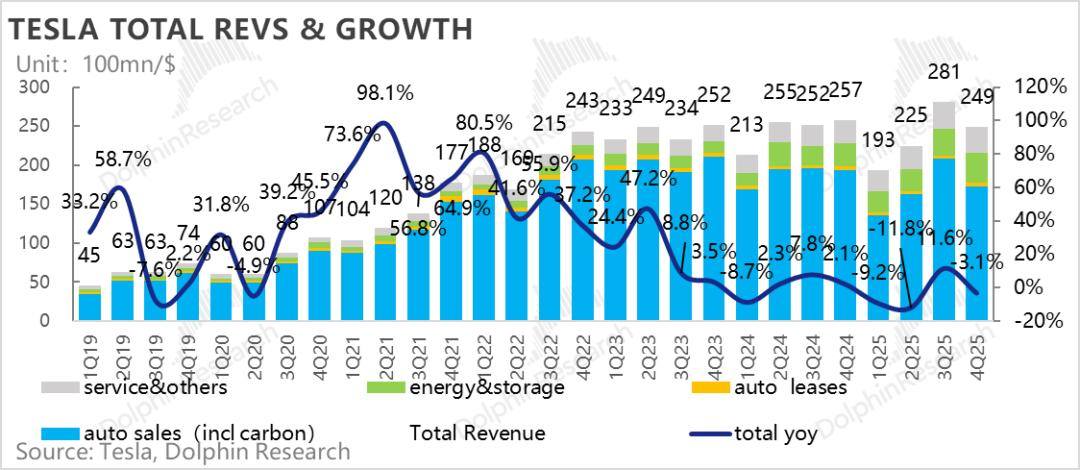 整体而言,特斯拉此次财报所谓的不错是在市场超低低预期的前提,显得没有那么差。关键是最核心卖车业务上,未陷入到 “销量差到业绩烂” 的恶性循环,卖车收入端由于单价下滑幅度并不大,以及FSD业务和碳积分业务对收入端的贡献,整体超预期。