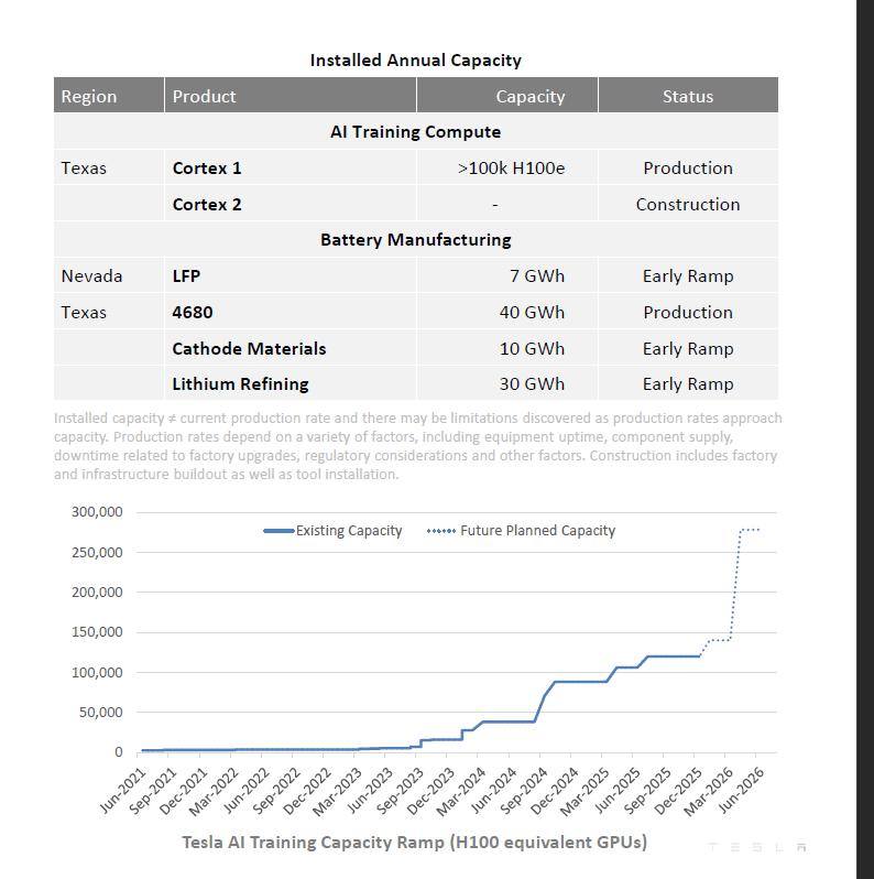 ② 为支持 Optimus 与自动驾驶训练,公司正大幅增加算力投入(特斯拉正在德州工厂建立cortex 2, 预计2026年上半年将计算资源规模再提升到当前的1倍以上,预计相当于超25万的等效H100水平);
