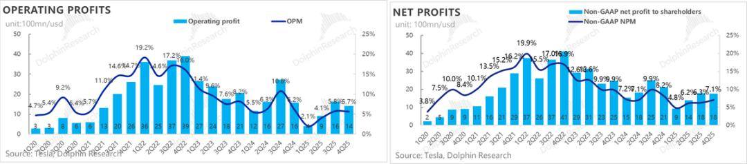 最终,虽然规模效应释放受阻,以及受关税负面影响加大,但可能由于美国政策补贴影响,特斯拉四季度的单车卖车成本反而在下滑,也带动了四季度卖车毛利率环比继续上行2.5个百分点至17.9%(去碳积分)。