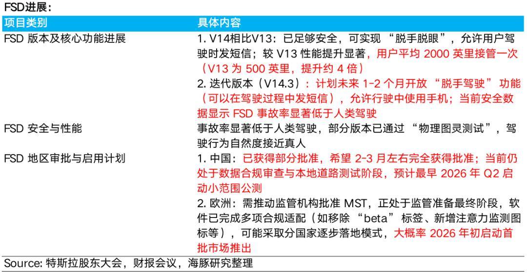 而对于FSD实现无监督驾驶的时间表,特斯拉虽然还没给出明确时间,但目前已在奥斯汀向公众提供了“无安全员、无跟随车”的完全的Robotaxi服务,而随着 FSD 版本的不断迭代及其安全性数据的指数级提升,特斯拉将按比例逐步减少对驾驶员的强制监控要求,直至最终在全球范围实现完全无监督。