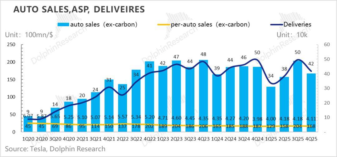 从卖车的单价端来看,四季度,特斯拉每卖一辆车的收入(不含碳积分与汽车租赁销售)是4.11万美元,环比上季度700美元,好于市场预期的4万美元。