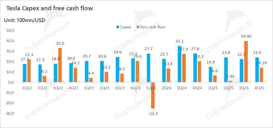 而在自由现金流方面,本季度运营现金流由于存货的增加,环比下行24亿至38亿,而资本开支上仍然还在为AI业务继续投入,本季度资本开支24亿(全年资本开支略低于特斯拉之前给的2025年90亿的指引),特斯拉的cortex训练集群已经在四季度超过了10万块等效100的算力水平。