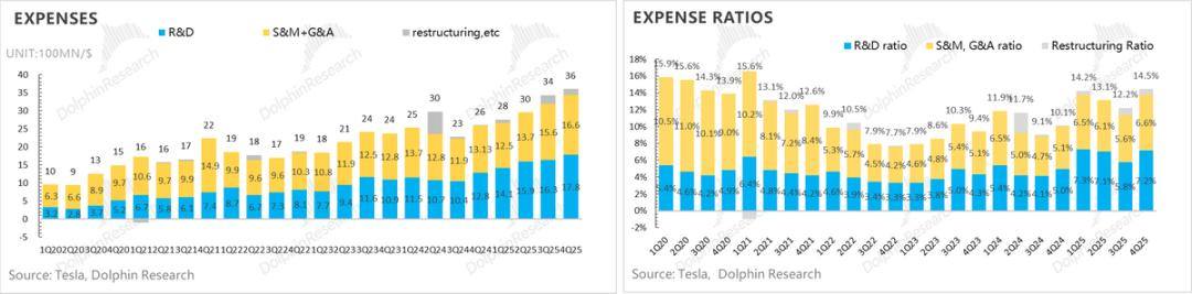 4、研发费用+资本开支的狂投都仍然在为AI的星辰大海业务买单:特斯拉本季度研发开支和销售费用又在继续加大,研发费用17.8亿,高于市场预期15.9亿,仍然由于AI智能化投入的继续加大,以及研发费用主要用于HW5.0芯片,Robotaxi和Optimus的投入,特斯拉指引研发费用支出在未来还会继续加大。