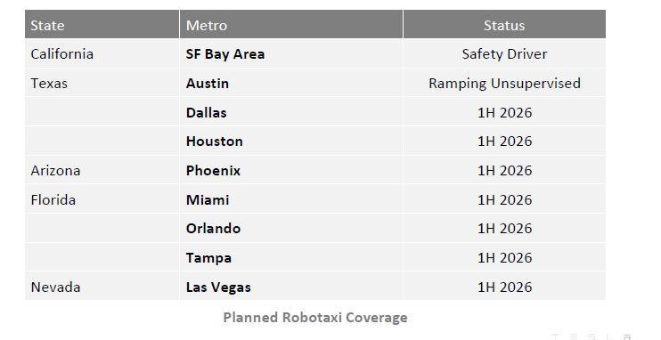 而展望2026年,专属Robotaxi车型 CyberCab (无方向盘、无踏板)将于2026年4月开始正式量产,在Robotaxi城市扩张上,2026 年底前计划覆盖美国 1/4 至 一半的地区(取决于联邦政策,采取逐市 / 逐州推进模式),目标进入数十个主要城市,车队规模预计以 “每月翻倍” 的速度呈指数级扩张;
