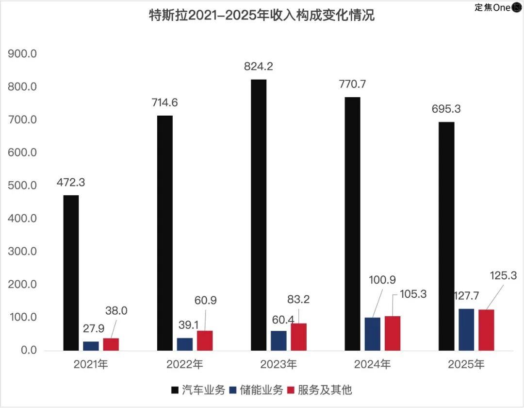 将时间线拉长,2022年Q4,特斯拉整车销售毛利曾高达48亿美元,而到了2025年第四季度,这一数字已不足20亿美元。其在公司总毛利中的占比,也从2021年的86.1%骤降至2025年Q4的45.8%。这表明,汽车业务在特斯拉的核心地位,已经大不如前。