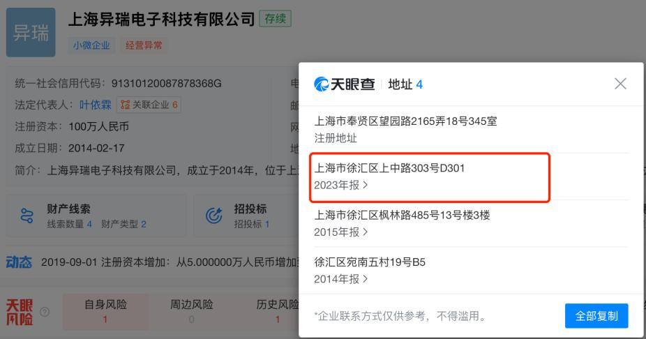 天眼查显示,2024年上海悬拓通信地址为“上海市徐汇区上中路303号D301”,2023年上海异瑞通信地址同样在此地。三瑞智能对「创业最前线」表示,凌莱科技为2016年通过展会开始与公司合作,其销售模式主要为经销、贸易;上海悬拓系公司长期合作客户,其销售模式主要为经销。