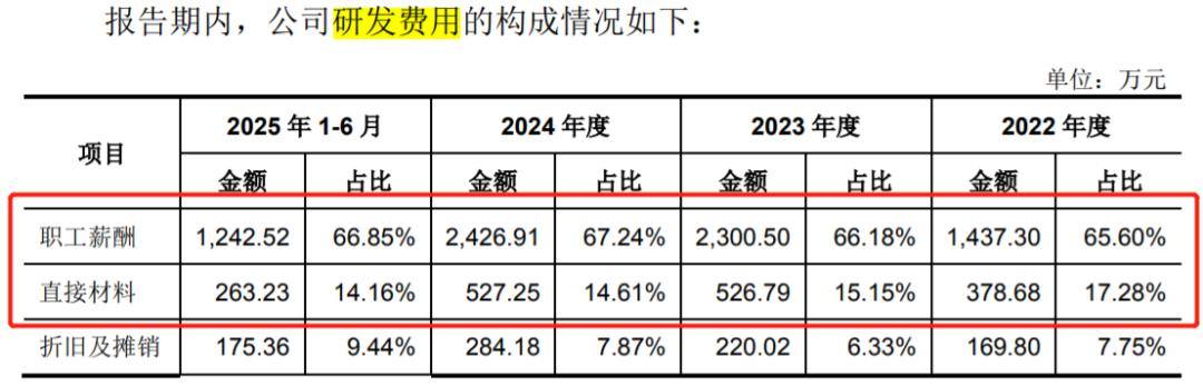 在研发费用构成中,薪酬成本占比在上升。2025年上半年,三瑞智能职工薪酬占比上升至66.85%,直接材料占比则持续下降至14.16%。