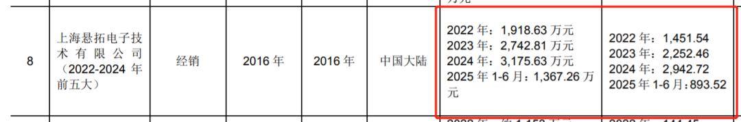 此外,上海悬拓电子技术有限公司(以下简称“上海悬拓”)长期位列公司前五大客户之列,但在2025年上半年,消失在前五大客户名单当中。