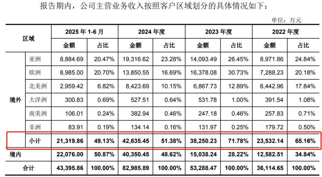 报告期内,公司境外收入分别为2.35亿元、3.83亿元、4.26亿元和2.13亿元,占比分别为65.16%、71.18%、51.38%和49.13%。