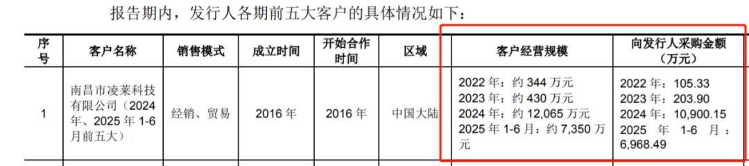 例如,2024年和2025年上半年,南昌市凌莱科技有限公司(以下简称“凌莱科技”)成为公司第一大客户,此前其从未跻身前五大客户之列。