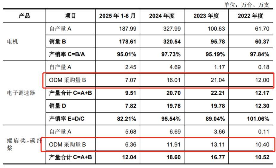 报告期内,电子调速器的ODM采购量分别为12万台、21.04万台、16.01万台和7.07万台,自产比例较低;螺旋桨的ODM采购量为10.40万台、13.11万台、11.91万台和6.36万台。直到2023年下半年,公司的螺旋桨才开始批量自产。