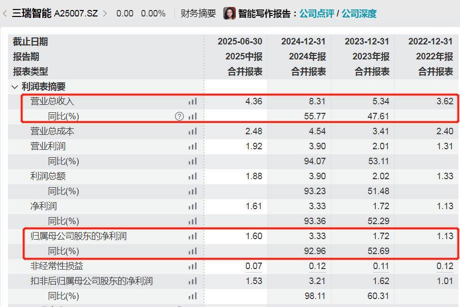 在这背后,三瑞智能业绩也在快速攀升。2022年至2025年上半年(以下简称“报告期”),公司分别实现营业收入3.62亿元、5.34亿元、8.31亿元和4.36亿元;归母净利润分别为1.13亿元、1.72亿元、3.33亿元和1.60亿元。