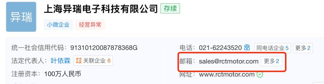 此外,上海易瑞邮箱地址为“sales@rctmotor.com”,而上述地址与该邮箱,与三瑞智能全资子公司江西新拓实业有限公司在上海的地址、邮箱完全一致。