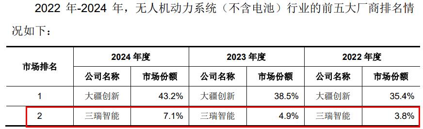 根据弗若斯特沙利文行业研究报告,按2024年销售额算,三瑞智能在全球民用无人机动力系统(不含电池)市场的市场份额为7.1%,在该细分领域排名第二,仅次于大疆创新的43.2%。